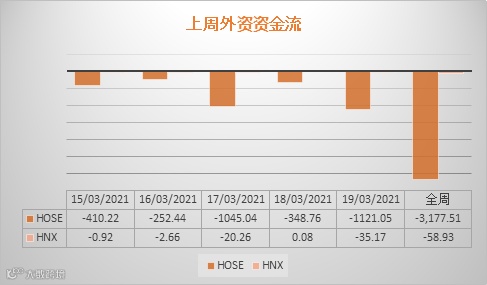 外资净售压力较强,上周外资净流出3.177万亿盾,三月份成为两年以来外资净流出最强的月份,其外资累计流出净额为9.539万亿盾。月初至今的累计净售额为12.607万亿盾,是2020年外资净售额的75%。利息提高趋势对新兴市场的越南明显影响,资金流出可能来自韩国机构并较为明显。