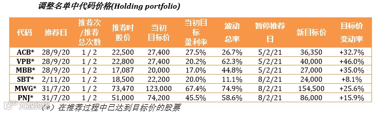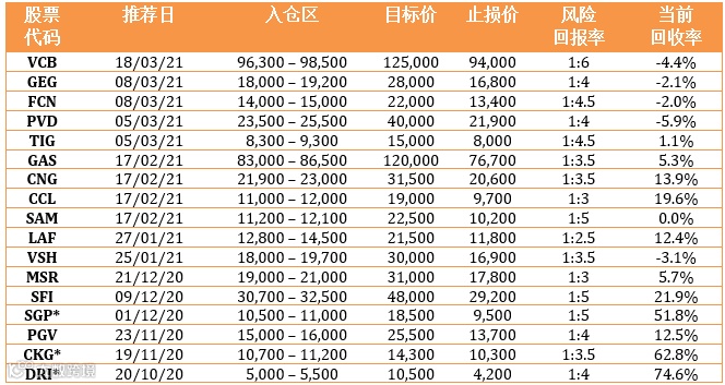 上周交易名单刚添加VCB代码。同时,DRI和SGP两只已经达到目标价,盈利率分别为90.9%和68.2%。