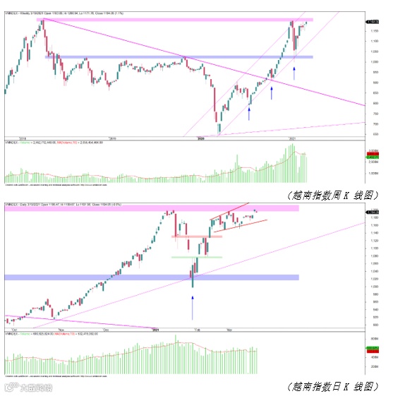 上周越南指数收盘上涨1.1%,全周波动幅度不大,收盘点高于开盘点,同时最高点位与收盘点有一定的距离,最低点为与开盘点有一定的距离。