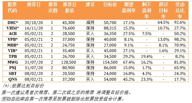 对于持有推荐组合股票的投资者,目前投资者暂时不应该增持股票,同时可以重组投资组合并转向到走到合理价格的流动性好股票。此外对银行、科技(FPT)和对房地产、建设材料、基础设施、物流等市场影响不大的中小市值股票 部分入仓。