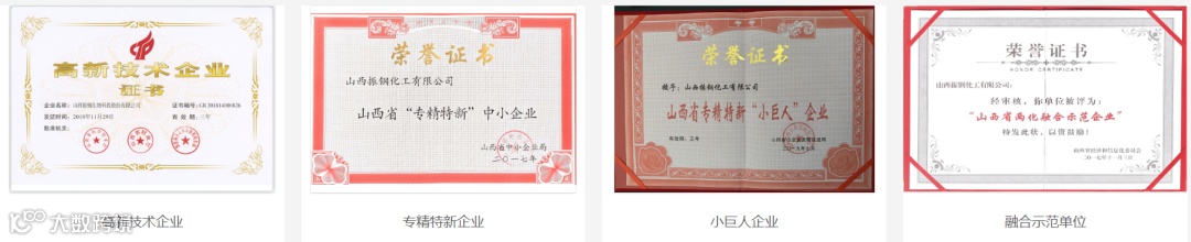 公司获实用新型专利16项、发明3项、商标1项、互联网“点商标”1项,癸二酸产品技术标准荣获忻州市科技进步二等奖,癸二酸产品通过欧盟REACH正式注册、韩国K-REACH预注册,以及ISO9001:2015质量管理体系认证、 ISO14001:2015环境管理体系认证、ISO45001:2018职业健康安全管理体系认证、AAA级质量服务诚信单位等多项资质认证。