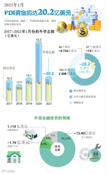 截至2021年1月20日,外国投资商的新注册资金、调整资金和购买股份资金总额约达20.2亿美元,相当于2020年同期的37.8%。