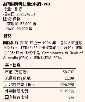 在IVS日报和周保中,我们于2021/2/5建议“买入”VIB股票。跟比较组合公司(peers)相比,VIB的P/E 低10%;因此在45,000盾-50,000盾的股价区可以继续保持。