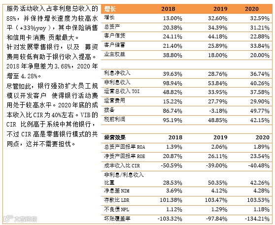 目前VIB是小规模私人商业股份制银行。银行的主要优势是零售贷款,具体是买房和买车贷款。经过四年之后,VIB 的买房贷款增长四倍,促使VIB列入买房贷款市额增长前位银行。与此同时,自2017年以来,该银行的买车贷款的市场份额排第一名。服务业务的地位较突出,2020年的信用卡数量增长和卡上消费排首位,据Mastercard报告,为行业平均水平的1,5-2倍。通过银行渠道销售 人寿保险排在前位,单个分支的销售效率多年排首位。