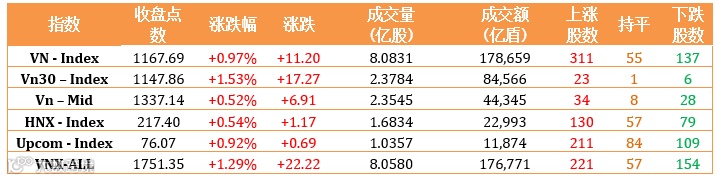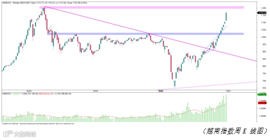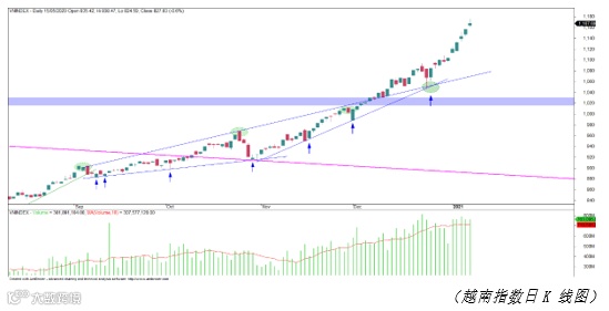 总体上看,全市场仍蓬勃上升并未出现利空信号,越南指数的下一个目标是2018年顶位的1.200点。