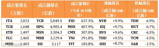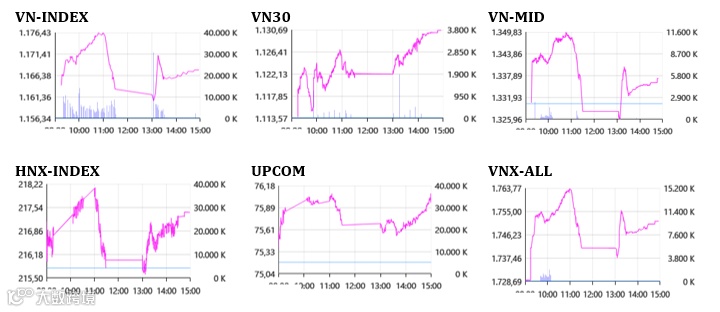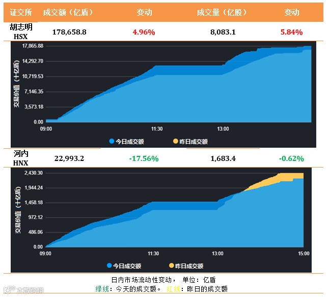 除了化工品的大市值股橡胶工业集团GVR(跌3.17%)以外,猛烈的涨势几乎蔓延到大部分行业。涨幅排名第一为银行、金融服务的证券股,具体龙越证券VDS 涨37.78%、投资发展银行证券BSI涨34.94% 和农业银行证券AGR涨34.4%;其次是科技信息的FPT涨7.11%。银行同时是拉升股价的主要动力,其中外贸银行VCB 涨7%、工商银行CTG 涨12%、技术商业银行TCB 涨13.3%和军队银行MBB 涨15.7%。跟随着银行股票,房地产股随之上涨。其中Vin集团VIC和Vin地产VHM分别上升3.33%和7.71%, Vin零售VRE涨13.06%和Nova 地产升14.7%。