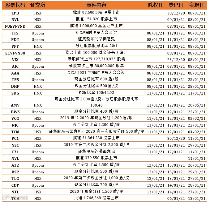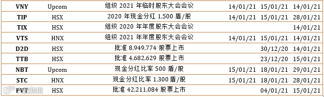 2021年第一个交易周,VN-Index开盘急剧上涨,涨幅为2020年5月份以来最高的幅度。然而,新年第一个交易周,指数的强劲涨势一方面拉升指数接近历史的阻力区,另一方面缩小诸多股票的涨幅。目前的新背景下,只有2020年第四季度的业绩(未有正式报告)以及未来几年的展望,两者都不明显;因此提高所持有股票的目标格价需要谨慎。尽管如此,经过2020年受疫情影响后,在2021年全球股市复苏的背景下,我们要看得出企业受世界各国的刺激经济政策在中长期将恢复,尤其是新上任政府的国家(将实施强劲的刺激政策)。