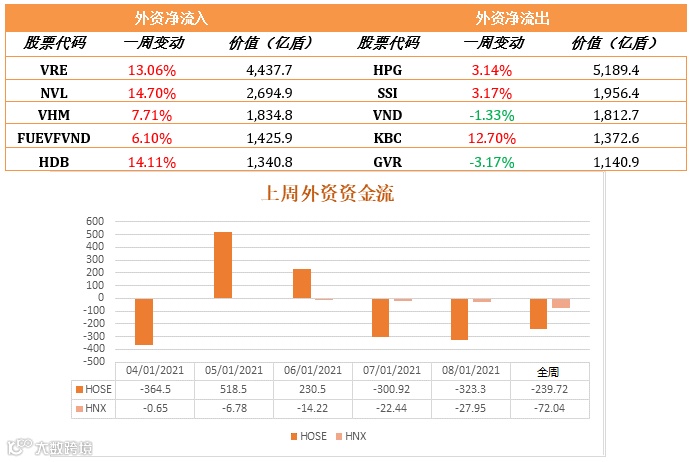 在胡志明证交所HOSE外资净流出3,255.4亿盾,河内证交所HNX外资净流出279.6亿盾。