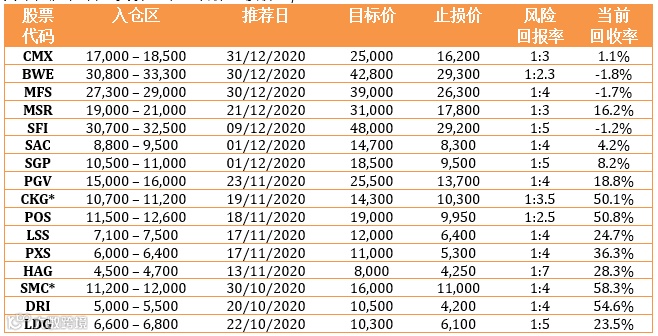 持股组合:对于已经远超过目标价格的股票,投资者可以降低持股比例。2020年企业业绩以及 2021年计划公告之后,我们将再次评估。