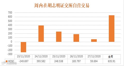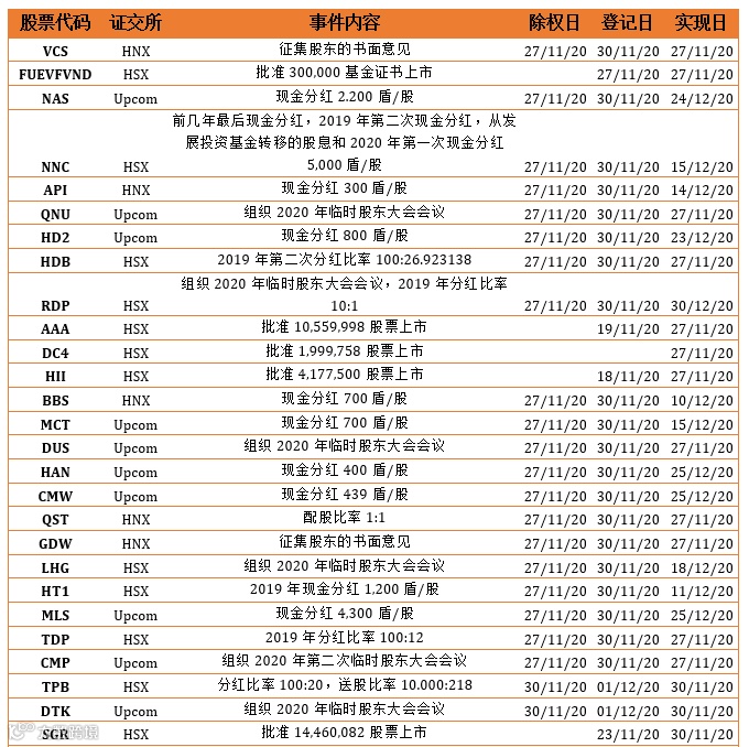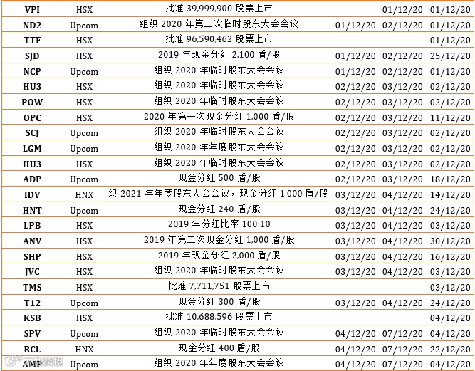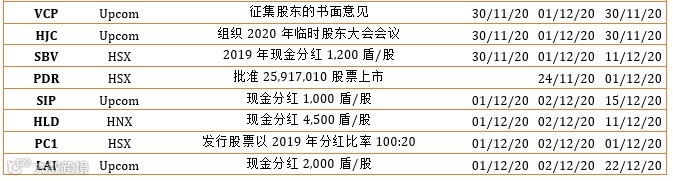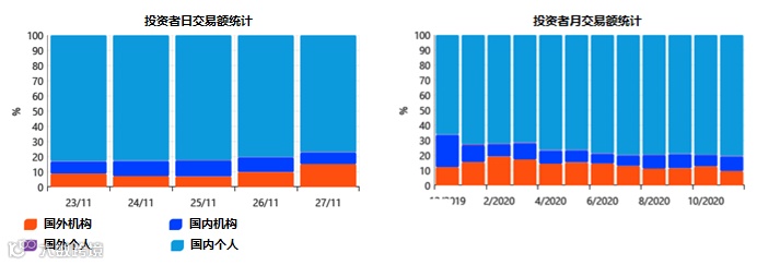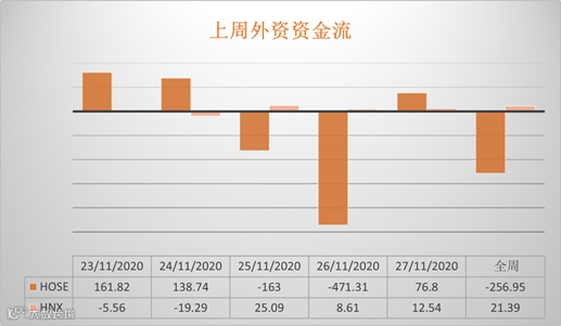 个人投资者仍是带领市场的主要动力,散户平均交易比重占交易价值的80%以上。上周外资回归净卖,主要原因是买单下降,胡志明发展银行HDB及和发钢铁HPG 等两只股票受外资最大卖压。与此同时,外资买入针对VN-Diamond的ETF 基金。反之,上周券商的自营净买入约 6359亿盾。投资基金而言,11月份资金比重有所上涨,主要原因是减持债券。