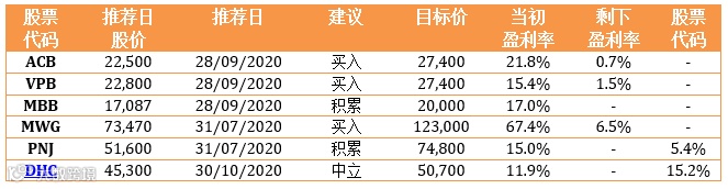 对于长期名单而言,市场上涨使得建议持股的银行股票已经接近目标价,富润珠宝PNJ和槟知东海DHC超过目标价。目前,世界移动MWG未达到目标价,但是剩下的上涨空间不大。