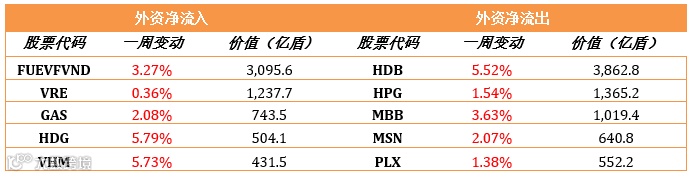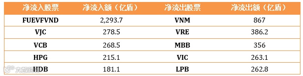 在胡志明证交所HOSE外资净流入779.7亿盾,河内证交所HNX外资净流入125.3亿盾。