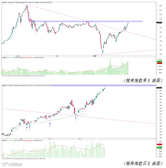 1,020 –1,030点区是开始了2019年8月至2020年3月的中期跌势,并可以成为高价位等待确认指令的猛烈阻力区。目前,越南指数几乎浅近了该点区,我们预测此事后将出现反应。