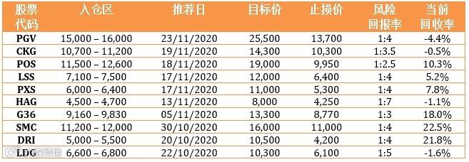 市场积极心理以及较高的成交量促使各股票步入上涨趋势,从而吸引资金流入。目前, IVS交易名单中得乐橡胶投资DRI、SMC投资交易SMC、36总公司G36、石油装配-金属结构PXS和PTSC海洋石油工程服务安装,运行与维护POS等5只股票显示涨势已经形成。
