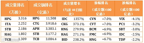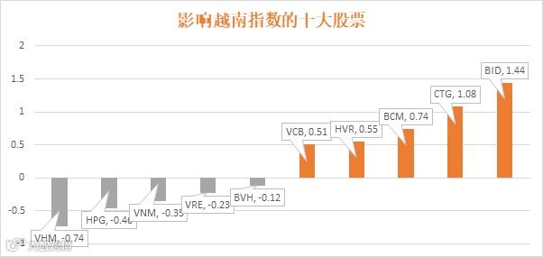 整体市场上,涨跌股票均衡,但是VN30板块中上涨股票占大多数并成为VNINDEX上涨的主要动力。投资发展银行BID、工商银行CTG、外贸银行VCB等银行板块股票和工业发展与投资总公司BCM、工业橡胶集团GVR、西宫啤酒SAB等蓝筹回归带领市场。反之是Vin地产VHM、和发钢铁HPG和越南牛奶VNM等股票。