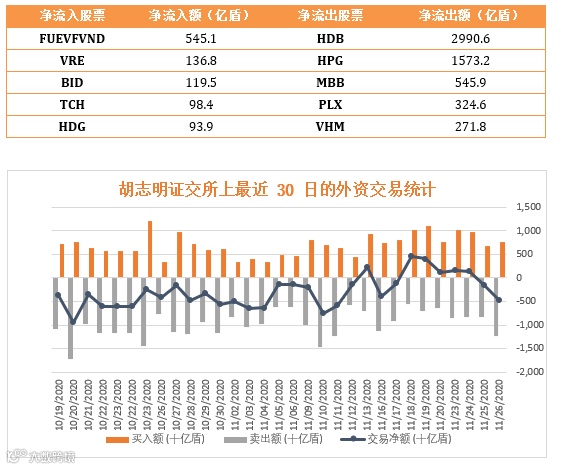 在胡志明证交所HOSE外资净流出4,764.9 亿盾,河内证交所HNX外资净流入86.2亿盾。