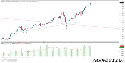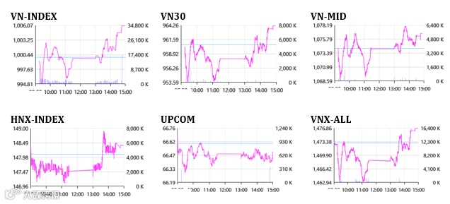 2020年11月26日越南指数早盘在参考价区波动,午盘涨幅继续放大并延续到收盘为止,集合竞价收盘交易ATC上涨,市场收盘在日内最高点位。