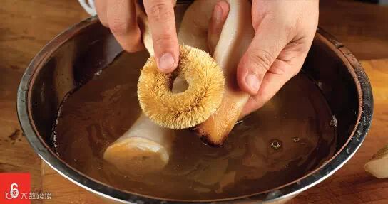6. 将黏在蚌肉上棕色的污迹和皮碎冲洗清擦。