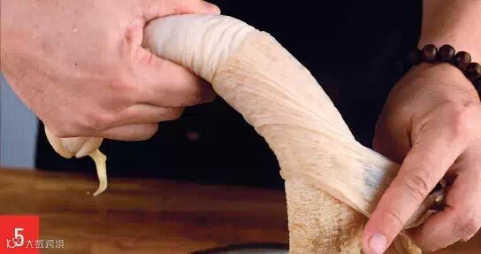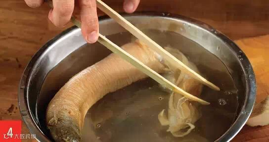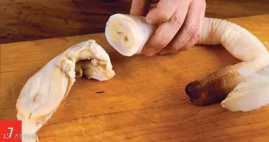 5. 如剥除圆筒鞘套般把外皮剥掉,露出里面嫩滑可食用的虹管肉。