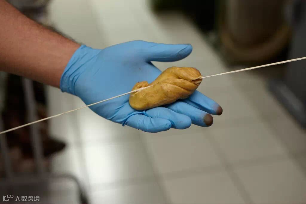 ▲Bontoni的标志性工艺之一是调整针线数以得到不同厚度。鞋匠用一大块蜂蜡摩擦线头,让它们合成一条长线。