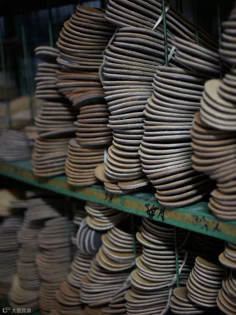 ▲成堆的皮质鞋底等待缝制。