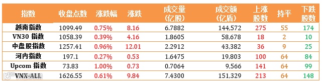 2020年12月29日,越南股市上午走横盘,下午盘初反弹上调,此后涨势放缓,继续横盘交易到收盘为止。总体市场上,上涨股票为多,上涨的行业占大多数。橡胶工业集团GVR对市场负面影响。反之,Vin地产VHM、外贸银行VCB、投资发展银行BID、Vin零售VRE、宝越保险BVH、Vin集团VIC和西宫啤酒SAB等股票对VNIDEX最积极贡献。