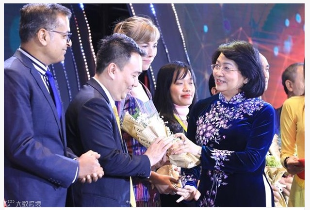 越南国家副主席邓氏玉盛向2020年越南100家可持续发展企业送花。