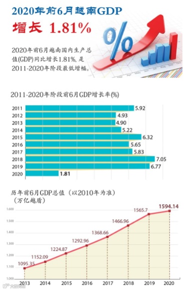 2020年前6月越南国内生产总值(GDP)同比增长1.81%, 是2011-2020年阶段最低增幅。