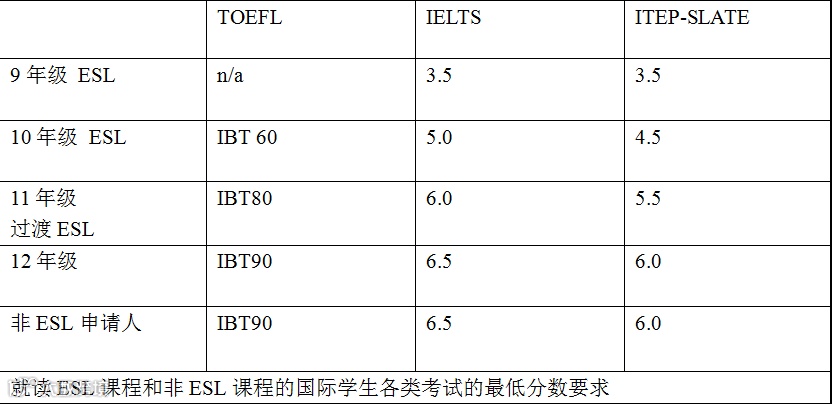 · 9-11年级的申请人可以入读学校的ESL 课程.ESL 学生需要完成入门的ESL9或者是ESL10,然后到过度阶段的ESL11,最后进入没有ESL的12年级。注册了ESL课程的学生,成绩优秀的有机会提前转入非ESL课程。