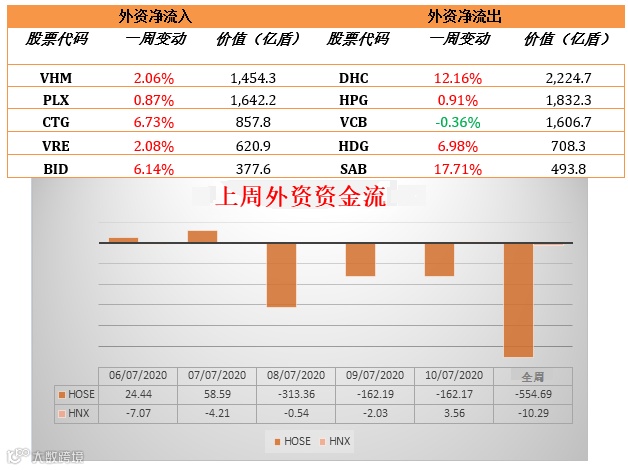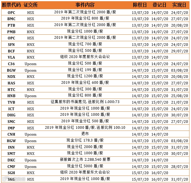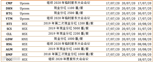 上周越南指数全周向好。消费行业中,由于工商部在8月31日前进行撤出全部持有的2.31亿股西贡啤酒SAB,相当於其资本的36%,所以上周带领市场的西贡啤酒SAB股价较前一周增长了17.7%。银行板块中,大幅降息政策及上半年信贷增长了2.13%表示越南经济体信贷吸引力有所放缓,平均利率也不高。原因可来自疫情后银行面临的风险。房地产行业中,Vinhomes 地产VHM与Vin集团 VIC一起实施绿色下龙复合市区,包括海边度假区、高尔夫球场与有关服务,其总投资金额近100亿美元。Vinhomes VHM 刚刚发行债券,总额为12千亿盾。值得关注的是,本周许多企业进行现金分红及配股。