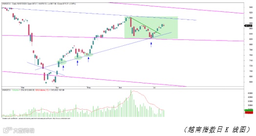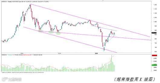 上周报我们预测,越南指数需要一周盘桓整理后才冲破近几周的下调阶段,但是上周一,各指数已冲上了该阻力区,并结束了前4周的跌势。随后两日,指数微涨,周四涨幅扩大,周五却小幅下调。该演变视为积极,但客观而言支撑力不够强并仍缺乏了上涨动力。原因可来自买盘订单不够强,未能扩大日中涨幅。成交量(volume)未突破,市场估价(valuation)可能未改善。越南指数刚逃离了连续4周下调阶段但完全能进入新一更大跌段,其包括了前两周的短期上升浪。这并不是理想演变但仍比逆转下滑的前景利好得多。