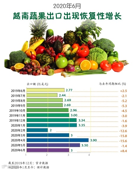 2020年6月,越南蔬果出口出现恢复性增长,出口额达3亿美元,同比增长8.4%。