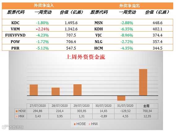 银行板块由于下半年信用增长的期望影响以及坏账担忧也大幅度下滑。其中外贸银行VCB 跌5.7%、工商银行CTG 跌4.7%、盛旺银行VPB下降4.7%、军队银行 MBB下降4.5%、投资发展银行BID 将4.1%;亚洲银行 ACB、技术商业银行TCB、胡志明发展银行分别下降 3%、6.9%和5.3%。大部分银行发布第二季度财报,大部分银行第二季度财报受央行的支持利息和贷款结账均较为乐观。短期时间内,支持信息将罕见。餐饮股票有所下降,其中啤酒板块的股票跌幅最大,西宫啤酒下降7.2%,河内啤酒下降6.3%。