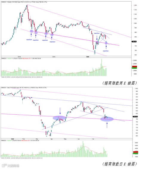 从技术方面来看,需要整理从2018年底-2019年初至今吸引资金流的链接,其添加2020年4月份短期顶峰等一些重要转折点。整理后发现,上周最低点区的780点就成为吸引资金流入区域。这理解之前所预测的观点:在低点区总会出现买盘订单吸收卖盘的资金流动,引进越南指数在此难以下滑,周中成交量也大于周均水平。此外,越南指数上周收盘点仍高于从6月份所形成中期走弱趋势的支撑区。目前,越南指数在处于中长期吸引资金流的区域。
