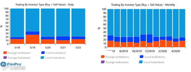 在投资者群体方面,5月19日交易日外国机构投资者交易量激增。上周,机构交易活动也相当活跃,其中值得一提的是,新加坡政府基金GIC收购了3890万MSN股份,同时减持了约70,090 VJC股票,并不再是越捷航空VJC的大股东。市场上最大的基金Dragon Capital继续增持康田房屋KDH,和发钢铁HPG和富润黄金PNJ,同时部分减持FPT数字零售FRT。