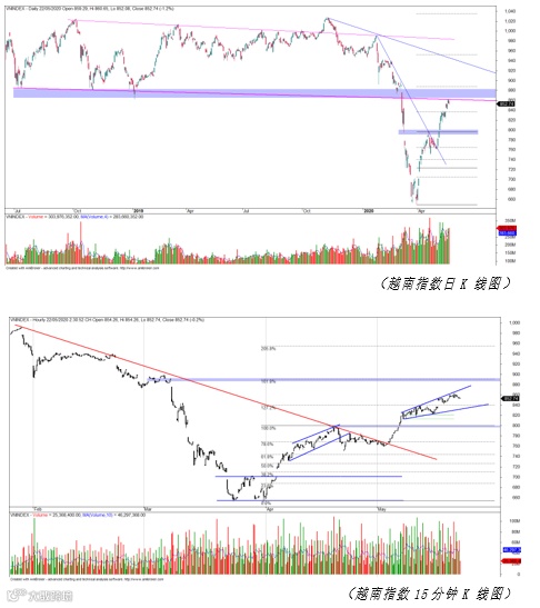 总的来看,市场仍在稳步上升,但由于更早接近潜在的阻力区域,上升势头正在放缓。就目标的详细计算而言,我们仍然认为,越南指数当前短期上升趋势的合理目标位于885-890点区,即是前期上升延伸浪161.8%的收敛区,并且是今年3月份出现购买力旺盛的区域(supplyzone)。然而,实际发生可能与计算预测不同,因此,投资者必须做好准备工作是十分重要的。