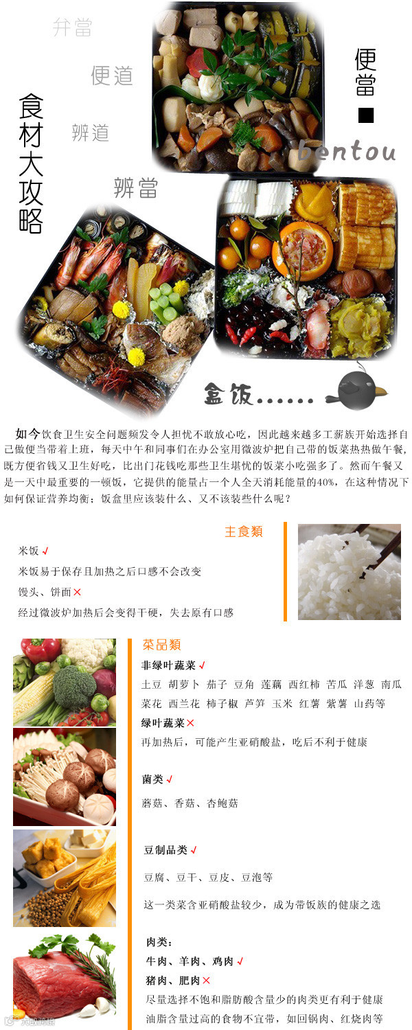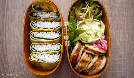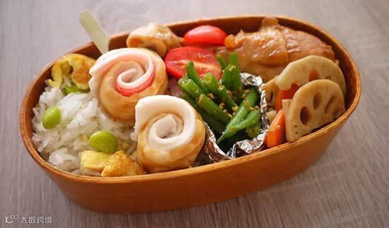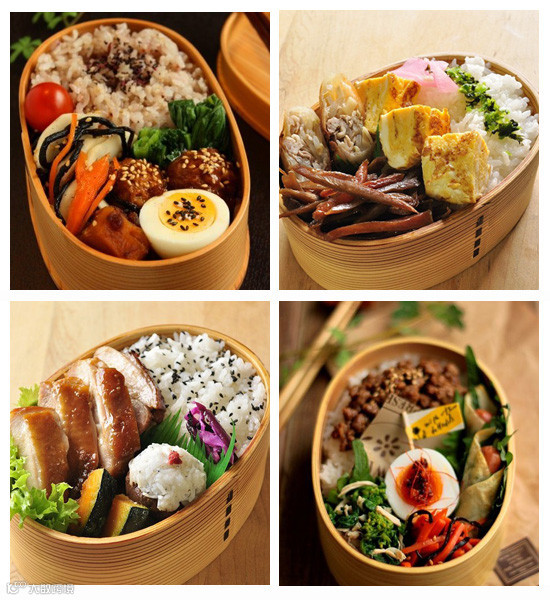 至今很多人也固守着这个习惯,并且还不厌其烦地配置了形形色色的饭盒、筷盒、饭兜和包饭盒用的方布巾等等,每天晚上洗净备好,同时备好各种食品。第二天早晨悉数张罗,一年四季乐此不疲。方方的盒子被隔出一个个小格子,里面每样菜都放上一点,一点饭,一点鱼或肉,再加一点色拉或蔬菜豆子什么的,搭配丰富营养全面。当然,便当也有其他种类,比如三明治,蛋包饭,寿司,手卷之类的。