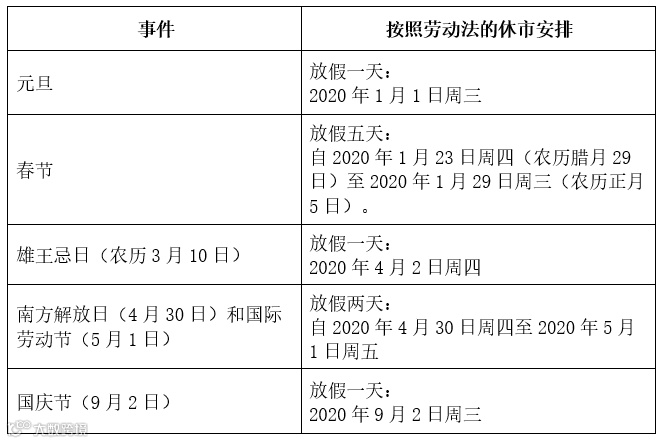 根据越南证券委员会公布的《关于2020年节假日放假和休市安排的通知》,胡志明市证券交易所HOSE和河内市证券交易所HNX通知2020年休市安排如下: