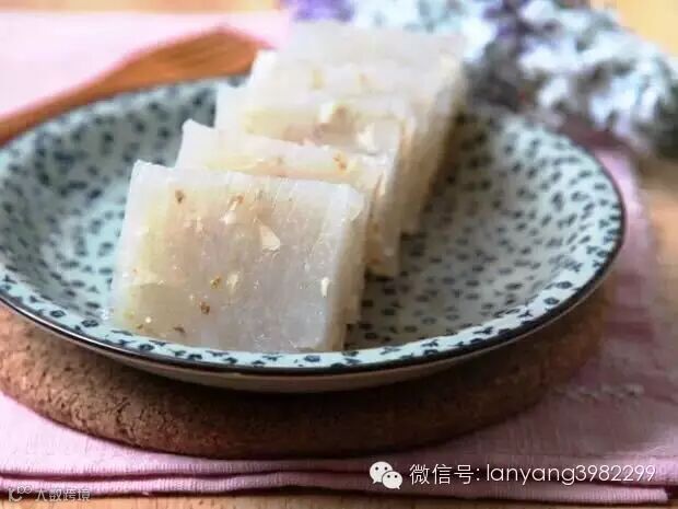 3.再将糕粉揿平 ,拉成长条 ,抹上植物油 ,撒上桂花 ,切成长方块即成。