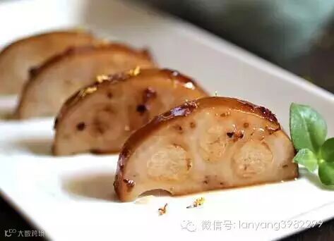 4. 藕段放入冷水,煮开后加冰糖,改小火慢煮,再煮1到2小时后关火,关火前半个小时放入糖桂花。5. 晾凉后切片,煮藕剩下的汁用藕粉勾个薄芡,不打欠也可淋上即可。