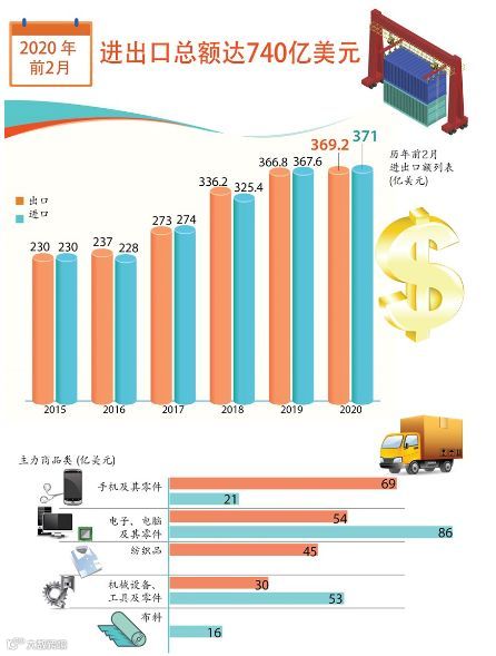 据越南统计总局的消息,尽管越南货物进出口活动遭受新型冠状病毒肺炎疫情的影响,但今年前2个月越南进出口总额仍保持增长势头。2020年前2个月越南货物进出口总额约达740亿美元,同比增长2.4%,其中出口额达369亿美元,增长2.4%;进口额达371亿美元,增长2.4%。前2月,越南进口逆差额达1.76亿美元。
