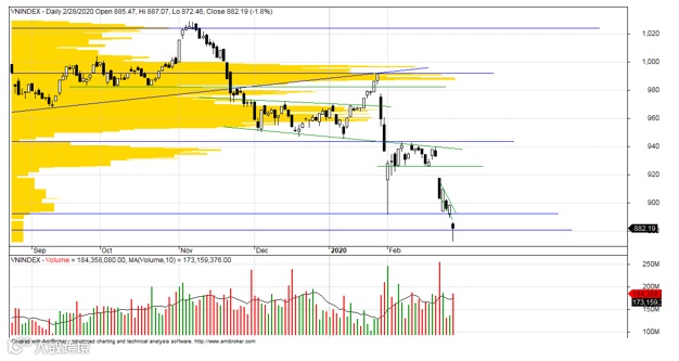 上周市场开盘立即暴跌,并收盘于最低位,跌幅3.2%。下几个交易日市场延续跌势,周末越南指数收报882.19点,下跌5.5%。上周市场走势不积极并且在一年半的长期横盘整理之后引发了人们对急剧下跌的担忧。上周值得注意的是: