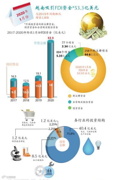 2020年1月份越南吸引FDI资金达53.3亿美元