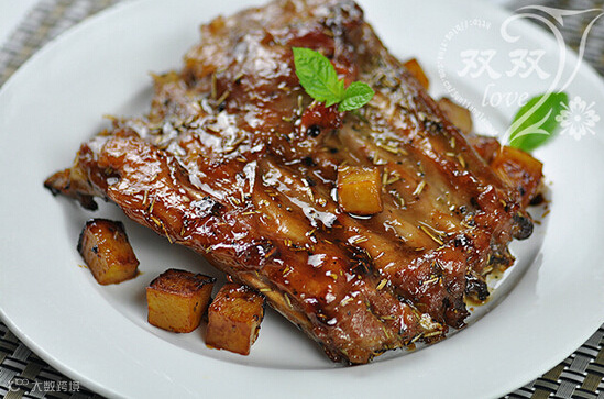 羊排400克、土豆1个、食盐半小匙、生抽2大匙、叉烧酱1大勺、白糖1茶匙、黑胡椒、迷迭香