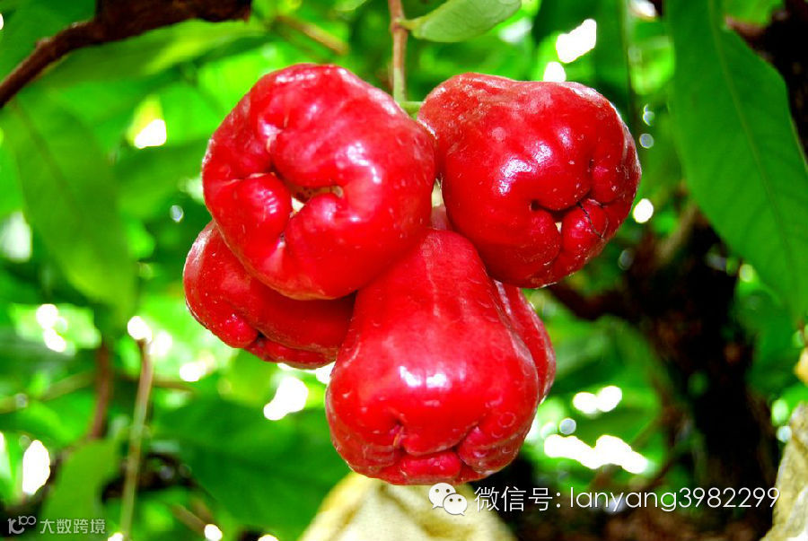 莲雾:大多种植在中国的台湾地区,均是国外引进的品种,莲雾的果实顶端扁平,下垂状表面有蜡质的光泽。果肉呈海绵质,略有苹果香味。莲雾的种类很多,果色鲜艳,有的呈青绿色,有的呈粉红色,有的呈大红色。