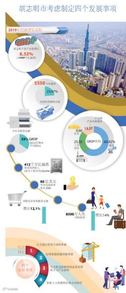 2019年胡志明市区域生产总值(GRDP)预计达1347万亿越盾,增长8.32%。2020年,胡志明市考虑制定4个发展事项。