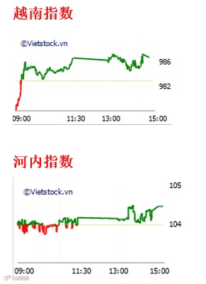 越南外贸银行VCB, 西贡啤酒SAB, 投发银行BID, 越捷航空VJC, 工商银行CTG, 和发钢铁 HPG等蓝筹股主力拉升指数。反之,越南牛奶VNM, Vinhomes 地产 VHM, 马山集团 MSN, Vin集团 VIC, 先锋银行TPB, 越南盛旺银行VPB有所下调。