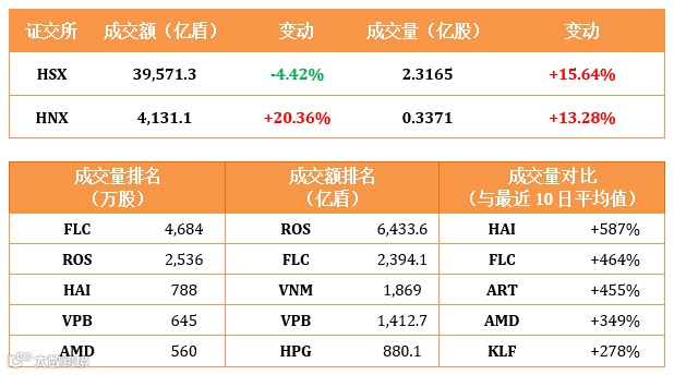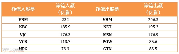在胡志明证交所HOSE外资净流入235亿盾,河内证交所HNX外资净流出217.4亿盾。