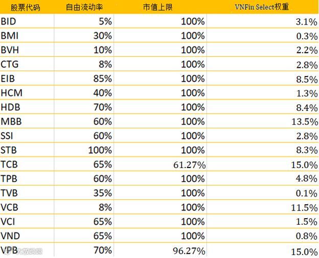 VNFin Select金融指数具有17只股票,包括10只银行股(越南投发银行BID,工行CTG,进出口银行EIB,胡志明市发展银行HDB,军队银行MBB,西贡商信银行STB,技商银行TCB,先锋银行TPB,外贸银行VCB,盛旺银行VPB),两只保险股(宝明保险BMI,宝越保险BVH),5只证券股(胡志明证券HCM,SSI券商,本越券商VCI,Vndirect证券VND,智越证券TVB)。