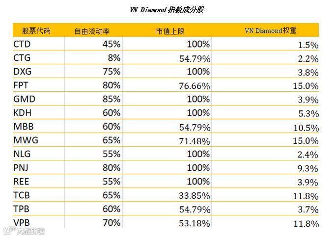 VN Diamond指数14只成份股名单中有5只银行股(包括越南工行CTG,军队银行MBB,技商银行TCB,先锋银行TPB和盛旺银行VPB)。其中,FPT科技和世界移动MWG的股票权重最大为15%,其次为TCB,VPB两只银行股,比重为11.8%。
